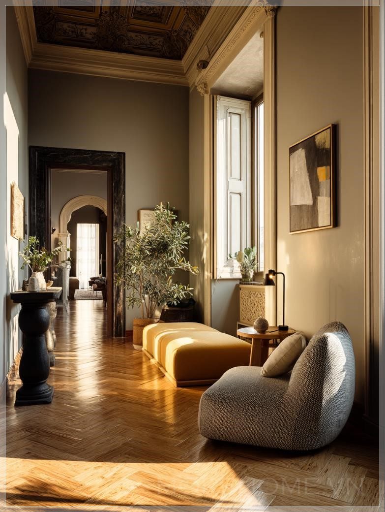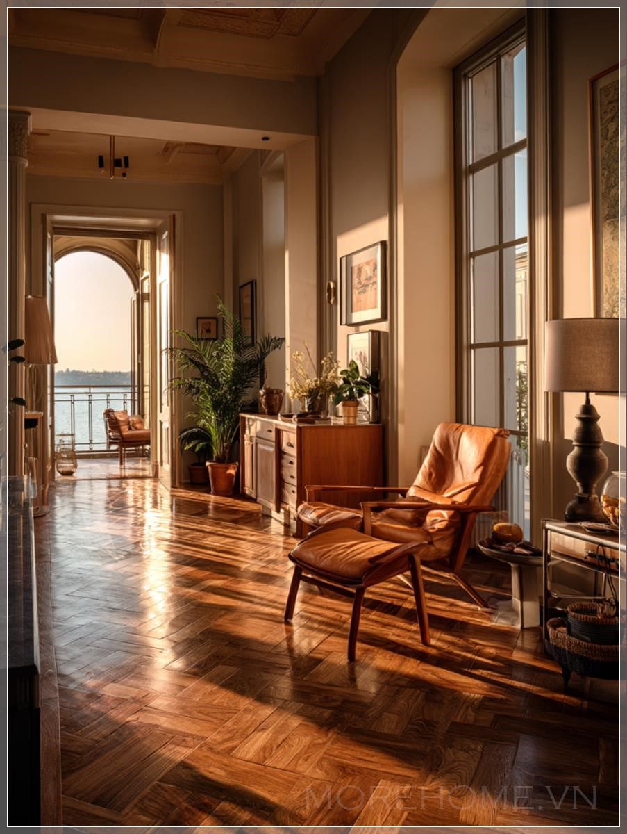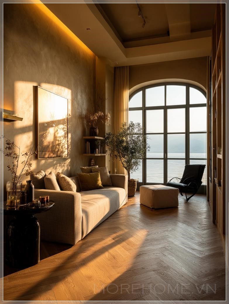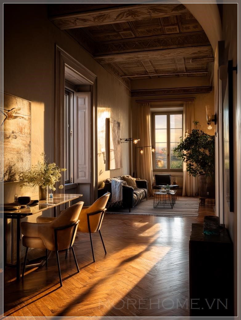 Ảnh chụp nội thất căn hộ sang trọng, Hồ Garda, ánh sáng giờ vàng, phong cách ấm áp và tinh tế, được sắp xếp chuyên nghiệp, bố cục điện ảnh.
