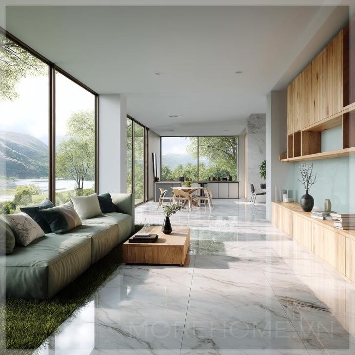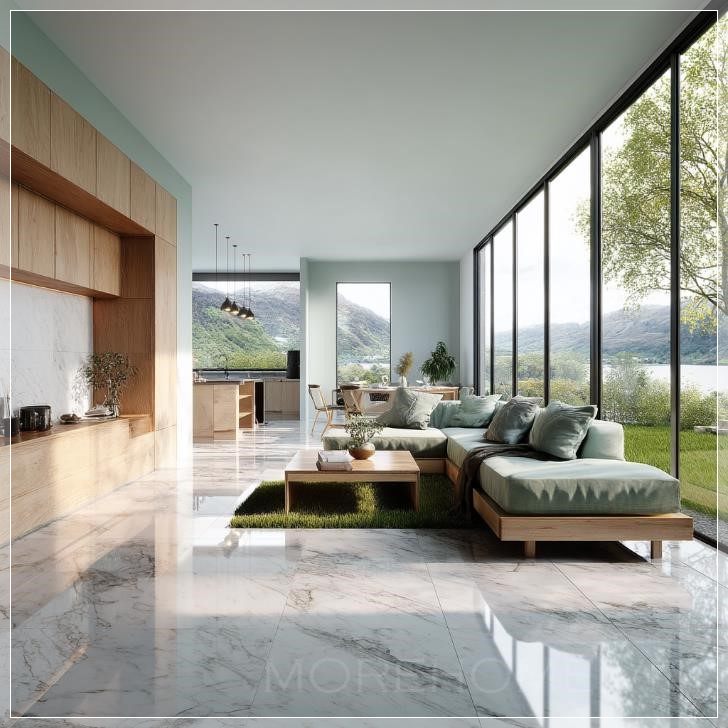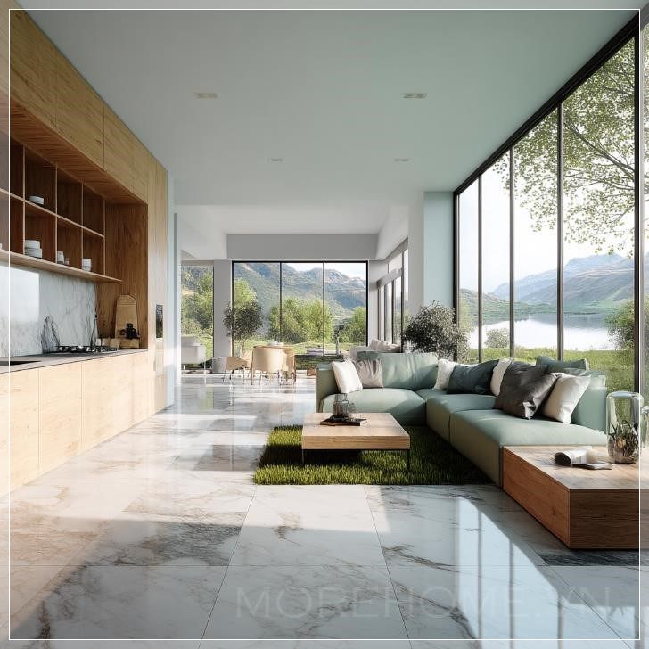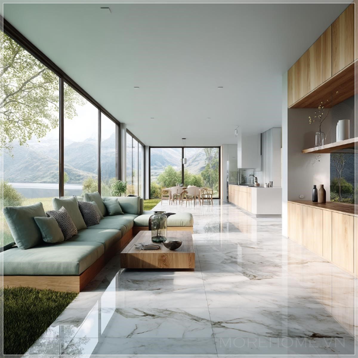 Phòng khách hiện đại với sàn đá marble trắng, tủ gỗ sáng màu và cỏ xanh trên nền. Cửa sổ lớn nhìn ra phong cảnh tuyệt đẹp, với căn bếp nằm trong nền. Những bức tường màu trắng, điểm xuyết các chi tiết màu xanh nhạt. Cảnh vật này mang phong cách siêu thực, điện ảnh, với ánh sáng tự nhiên, thể hiện rõ rệt trong nhiếp ảnh thiết kế nội thất qua bản render 3D.