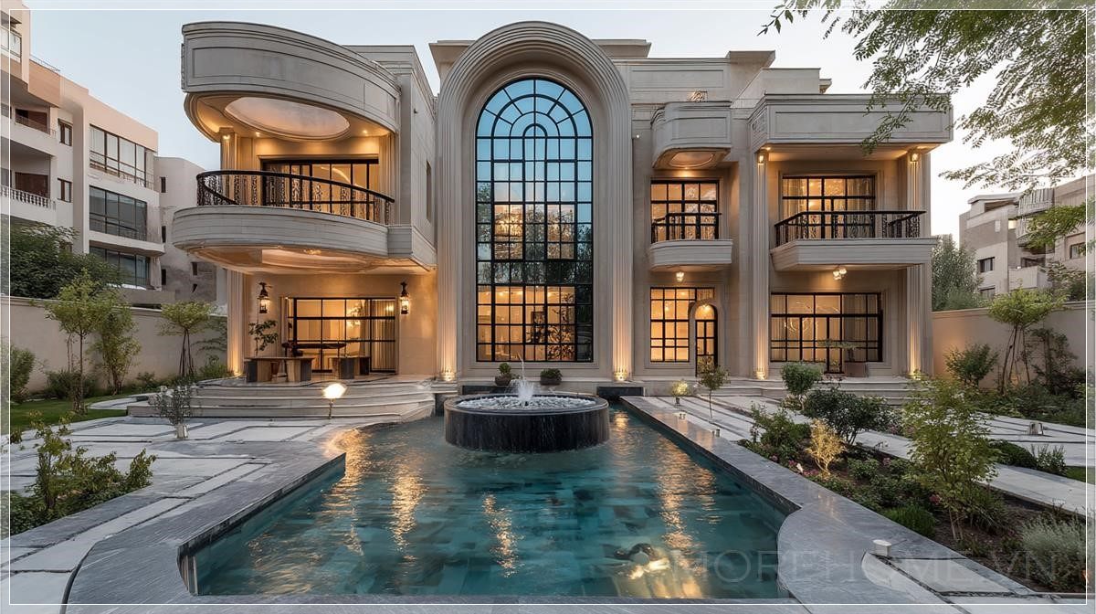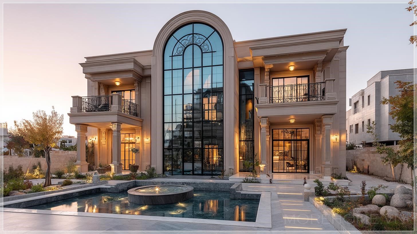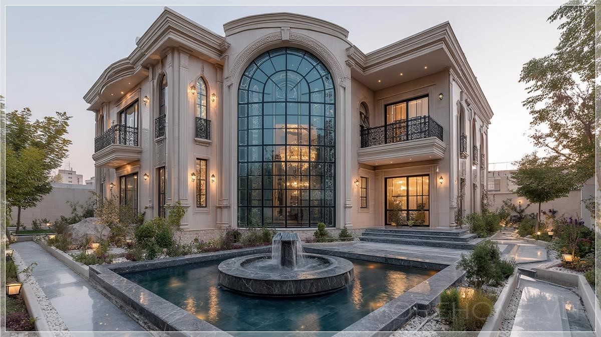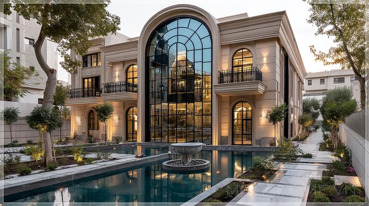 Mặt sau của biệt thự sang trọng, phong cách hậu hiện đại tân cổ điển, cửa sổ kính lớn hình vòm màu xanh nhạt ở trung tâm, không có cột, ban công duy nhất tinh tế chia ba tấm kính trên tầng trên, hai ban công đối xứng ở hai bên, lớp vỏ GRC màu be nhạt với các đường nét sạch sẽ, khung cửa sổ kim loại màu đen, chi tiết cổ điển tối giản, khu vườn xanh tươi với cấu trúc hoàn chỉnh và đài phun nước tròn ở trung tâm, lối đi bằng đá cẩm thạch hiện đại, ánh sáng hoàng hôn nhẹ nhàng, tường rào thấp bao quanh, không có các tòa nhà xung quanh.
