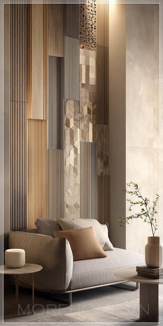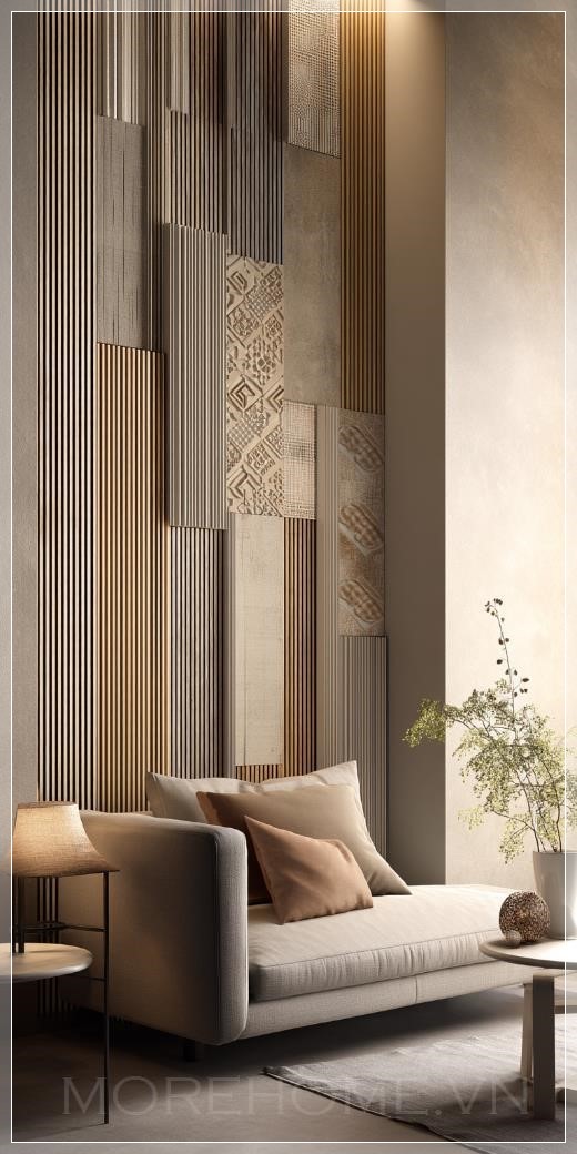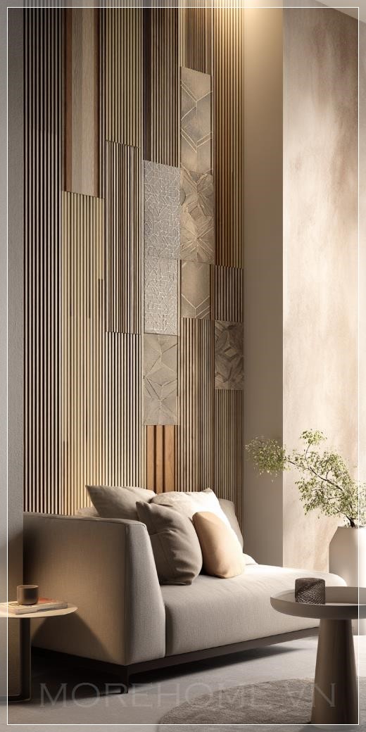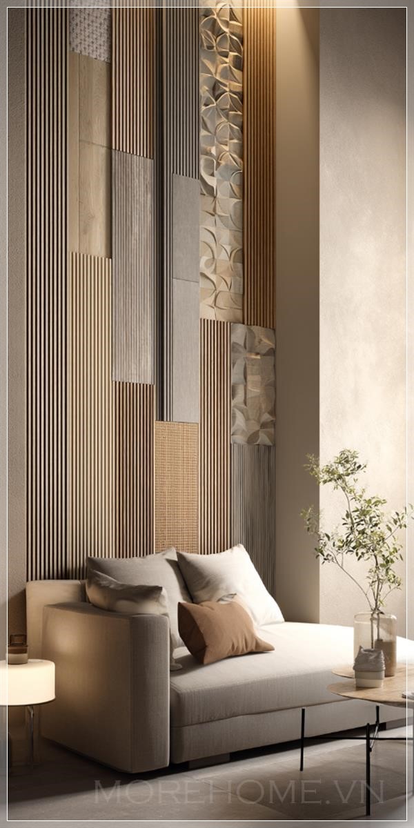 Tuy nhiên, điểm nhấn thực sự của góc phòng này lại nằm ở bức tường bên phải - nơi được trang trí bằng những tấm panel 3D với họa tiết rãnh dọc bằng gỗ sồi. Đây không chỉ đơn thuần là một bức tường, mà là một tác phẩm nghệ thuật sống động. Những đường rãnh dọc tạo ra hiệu ứng thị giác độc đáo, khiến ánh mắt người nhìn luôn bị cuốn hút và không thể rời xa. Khi ánh sáng chiếu vào, những bóng đổ nhẹ nhàng hình thành giữa các rãnh tạo nên chiều sâu và sự biến đổi liên tục theo từng thời điểm trong ngày.