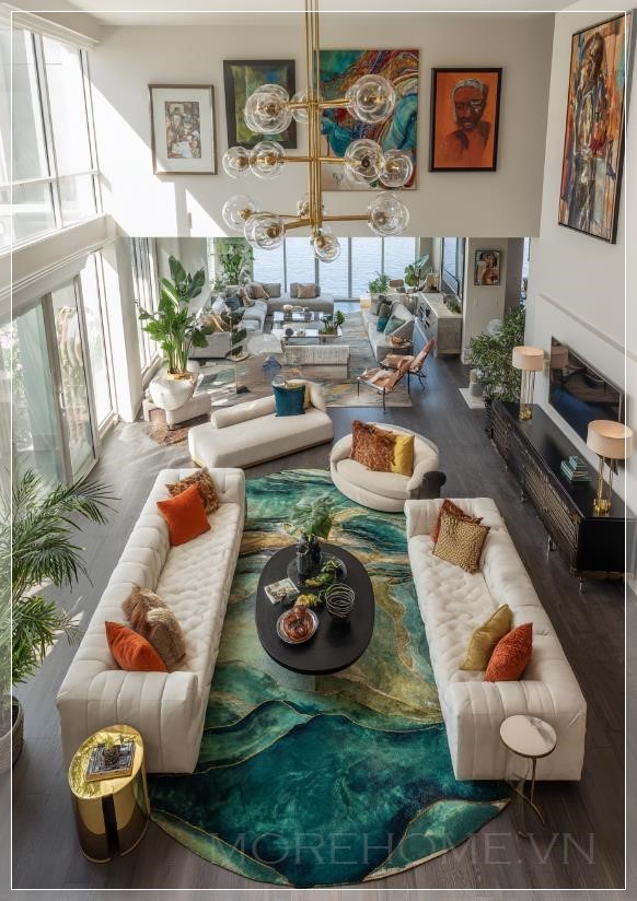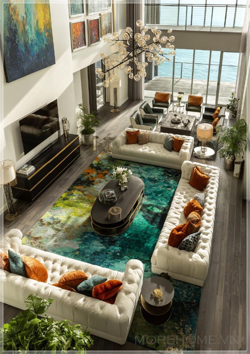 Thảm trải sàn với gam màu xanh lá và xanh ngọc bích, họa tiết abstract nghệ thuật không chỉ là điểm nhấn màu sắc mà còn định nghĩa ranh giới của từng khu vực chức năng. Chiếc bàn cà phê hình oval với khung kim loại bóng loáng phản chiếu ánh sáng, cùng những chiếc bàn side tròn nhỏ xinh với chân kim loại tinh xảo, tạo nên sự cân bằng hoàn hảo giữa tính thẩm mỹ và công năng sử dụng.