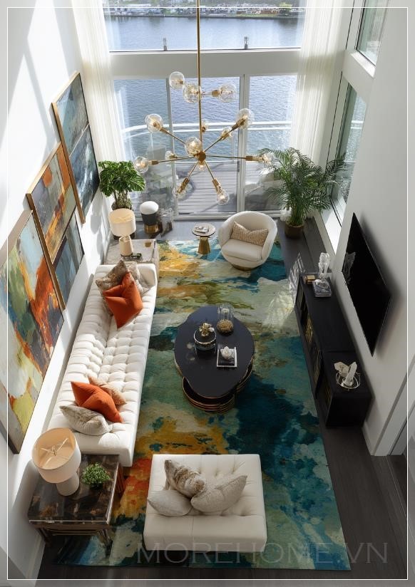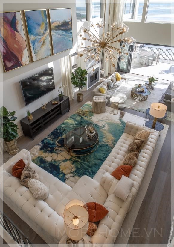 Ánh sáng ban mai nhẹ nhàng len lỏi qua những tấm kính lớn, thắp sáng căn phòng khách rộng lớn với một vẻ đẹp mê hoặc khó tả. Đây không chỉ là một không gian sống thông thường, mà là tác phẩm nghệ thuật kiến trúc nội thất tinh tế, nơi mà sự sang trọng và thoải mái hòa quyện một cách hoàn hảo.
