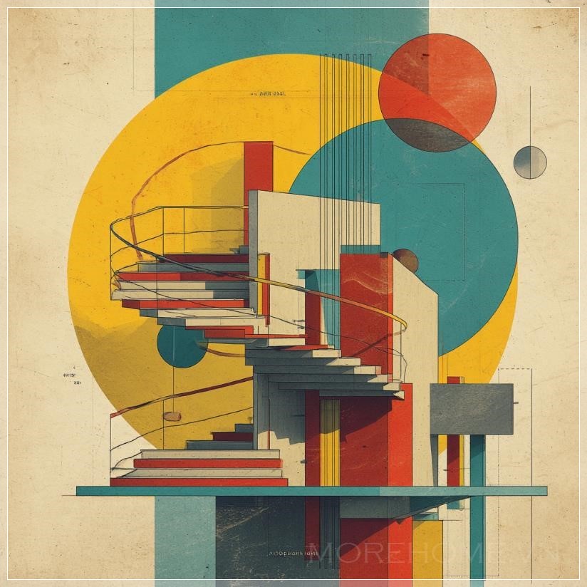 Trong thế giới của những hình khối geometric và màu sắc tối giản, một cầu thang xoắn ốc bắt đầu hành trình bất tận của mình. Không chỉ đơn thuần là một yếu tố kiến trúc, nó trở thành biểu tượng của triết lý Bauhaus - nơi hình thức tuân theo chức năng, nhưng cũng vượt xa những giới hạn vật lý để đạt đến cảnh giới siêu thực.