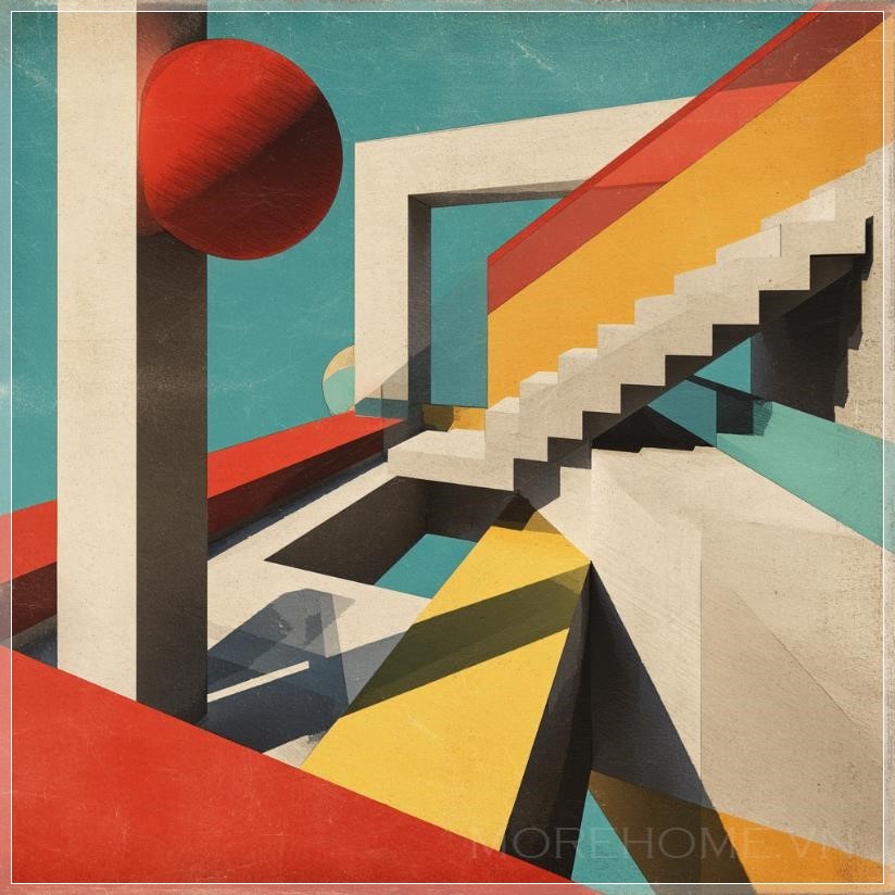 Những bậc thang được tạo nên từ những đường thẳng sắc nét, mỗi góc cạnh đều được tính toán với độ chính xác của một nhà toán học. Màu đỏ rực rỡ của một số bậc thang tương phản mạnh mẽ với gam màu trung tính, tạo nên nhịp điệu thị giác thu hút ánh nhìn theo từng bước chân tưởng tượng. Cyan và vàng xuất hiện như những điểm nhấn, không ngẫu nhiên mà được sắp đặt theo nguyên tắc cân bằng màu sắc của phong trào Constructivism.