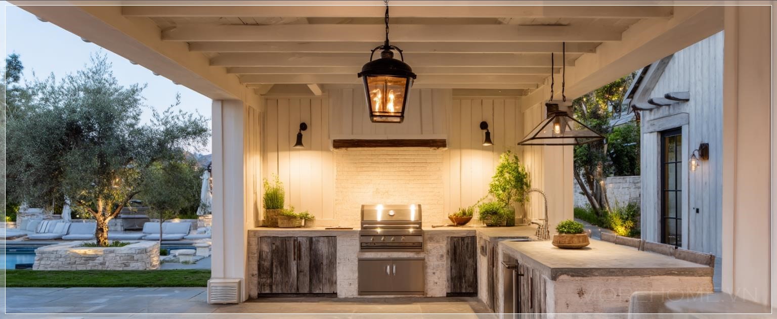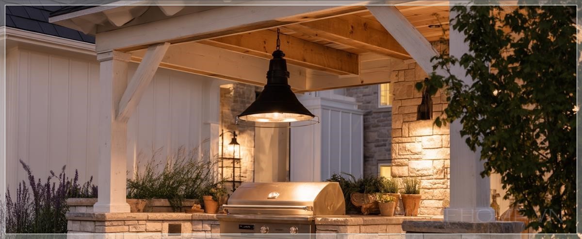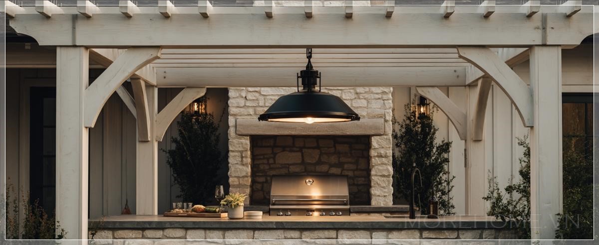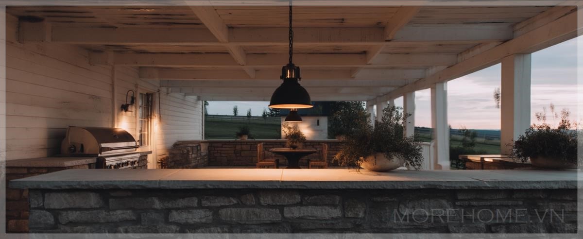Giữa ánh sáng mờ ảo của buổi chiều tà, một không gian bếp ngoài trời phong cách nông thôn hiện lên đầy ấm áp và quyến rũ. Dưới mái vòm gỗ trắng sơn tươi, không gian bếp này là sự kết hợp hoàn hảo giữa nét cổ điển và hiện đại. Chiếc đèn treo ngoài trời vintage màu đen, nằm ngay giữa khu vực chế biến, tỏa ra một ánh sáng dịu dàng, ấm áp, tạo nên một sự tương phản nhẹ nhàng với ánh sáng tự nhiên của hoàng hôn.
