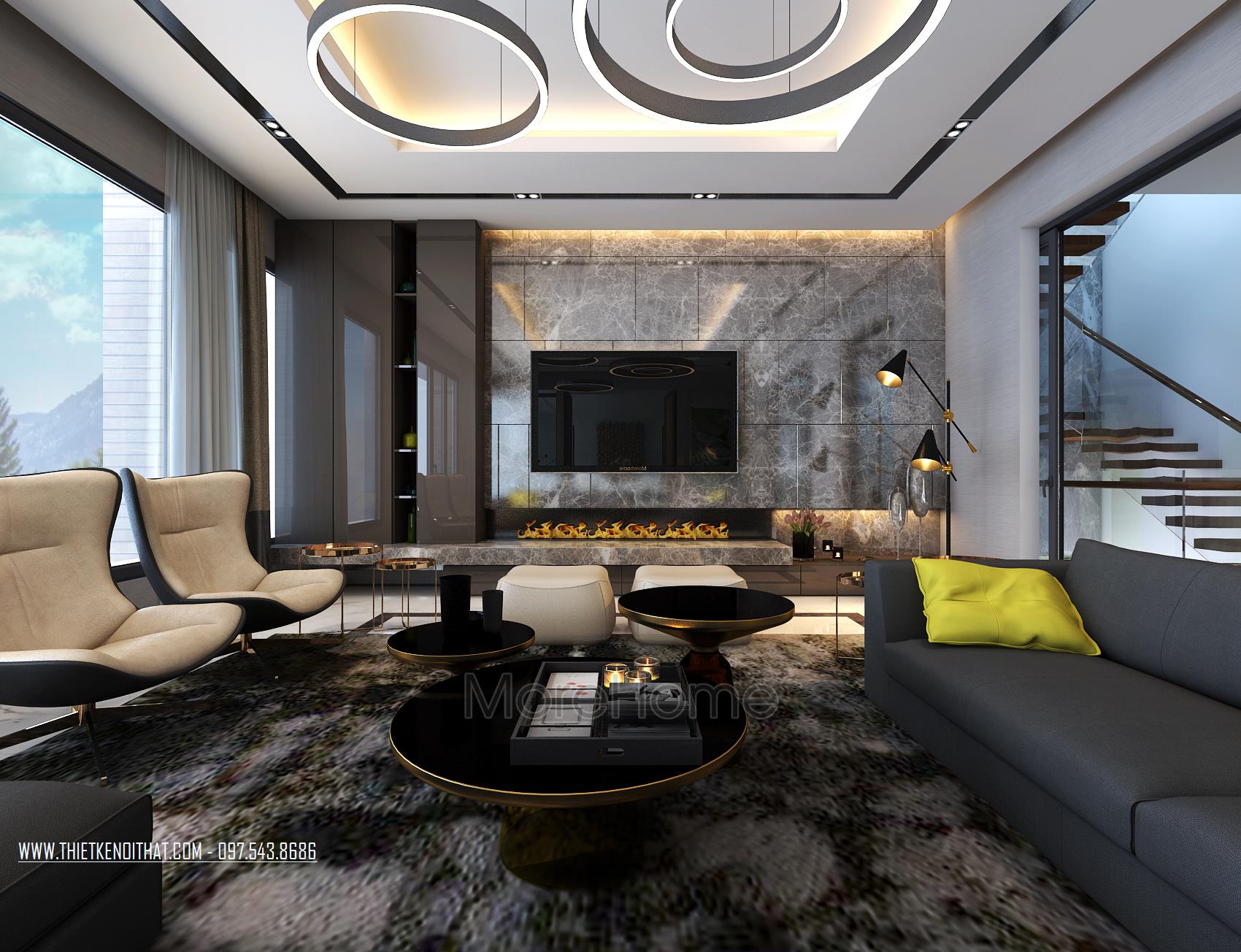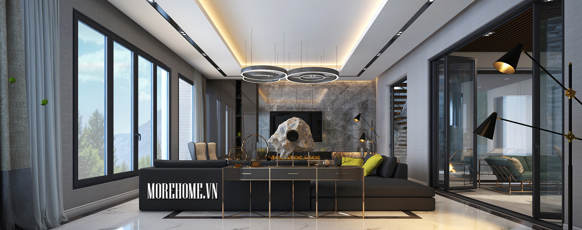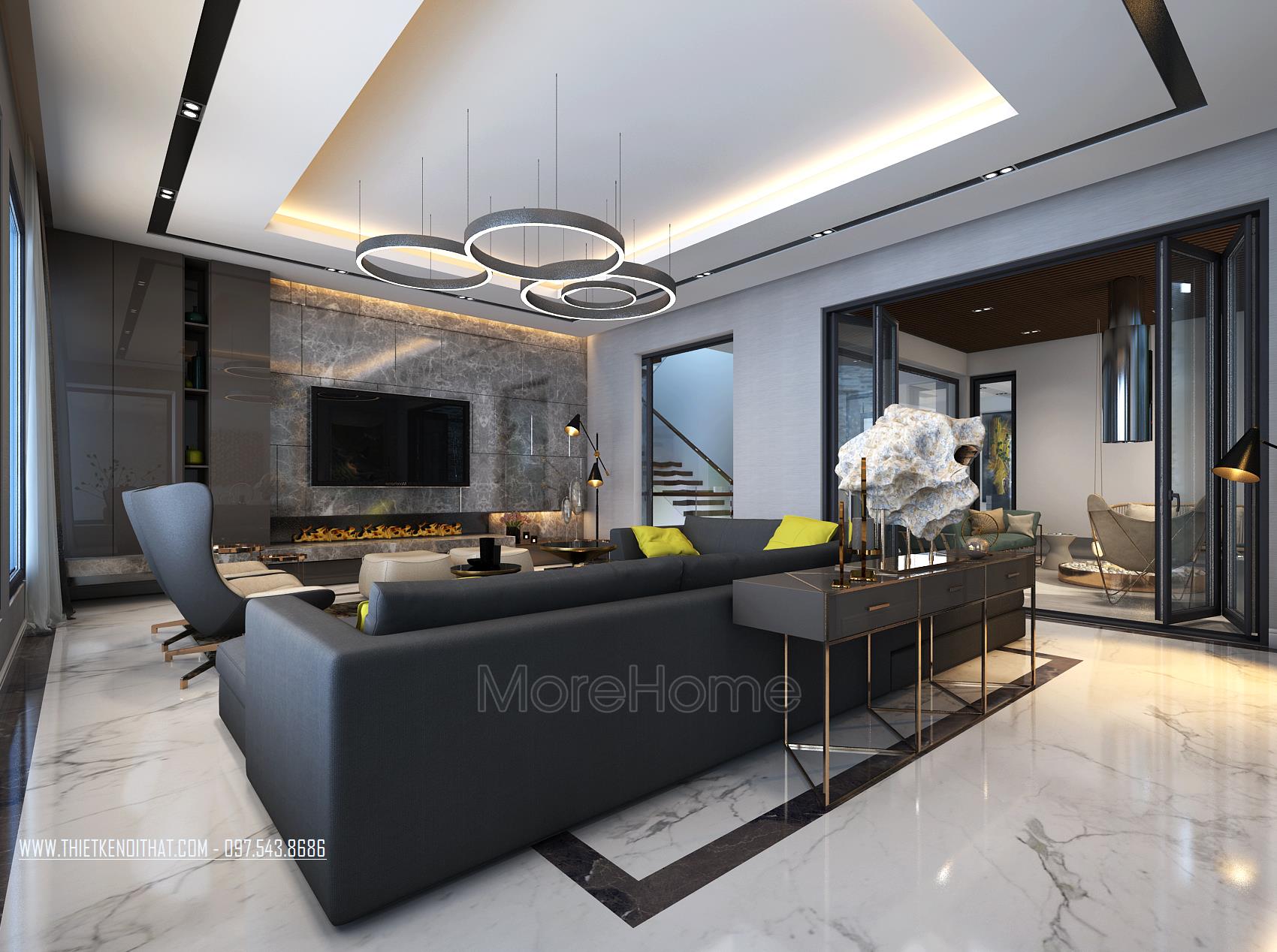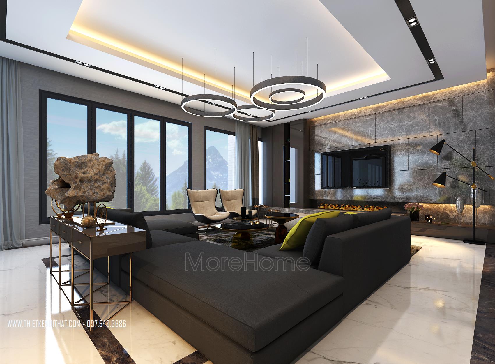 Thiết kế nội thất phòng khách biệt thự hiện đại sử dụng tone màu tối làm chủ đạo. Thiết kế ghế sofa đơn giản, không cầu kỳ về chi tiết, mang đến sự cân bằng và thoải mái về đường nét cho thiết kế. Ghế sofa được lựa chọn khá linh hoạt, có độ mở lớn, dạng to bành vững chãi gợi cảm giác an toàn và vững chãi. Không gian phòng khách bị bao bọc bởi bốn bức tường thô cứng đã được thay đổi hoàn toàn, thay vào đó là thiết kế mở với kính cường lực trong suốt và thiết kế mảng tường vân đá tự nhiên.