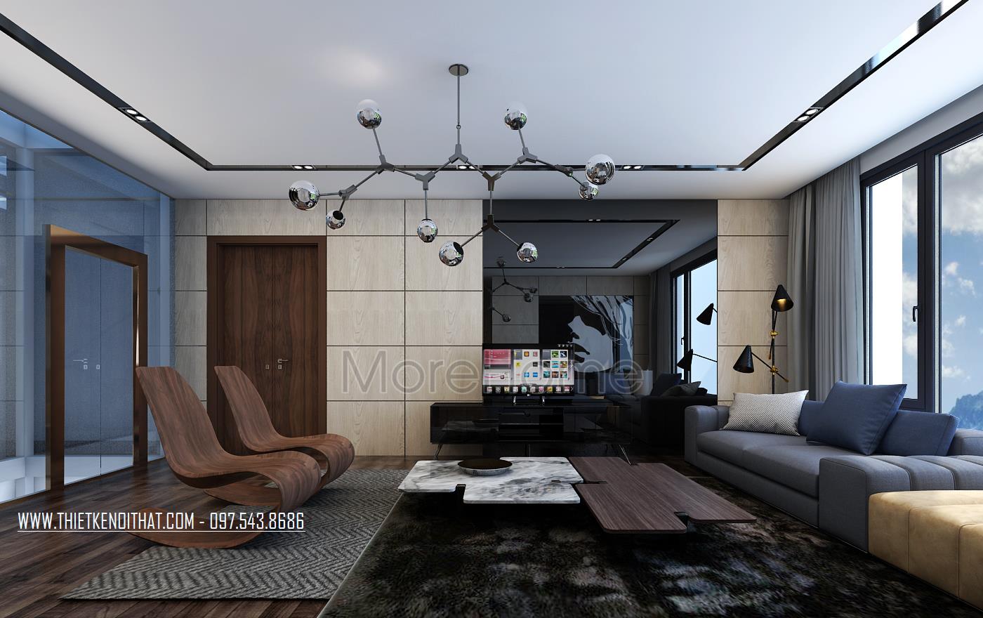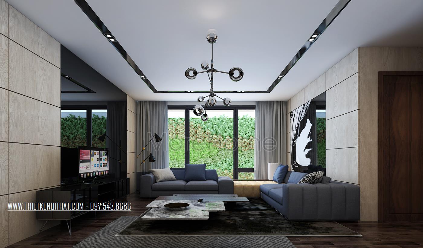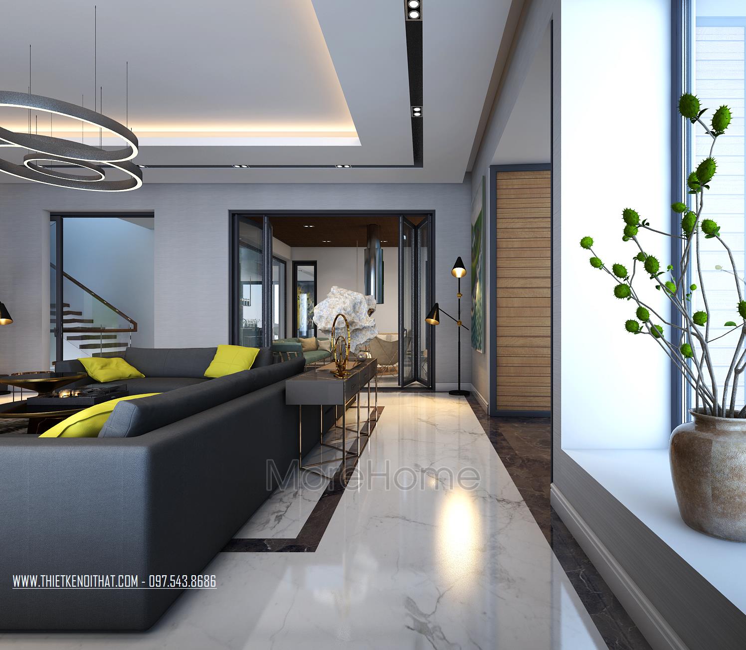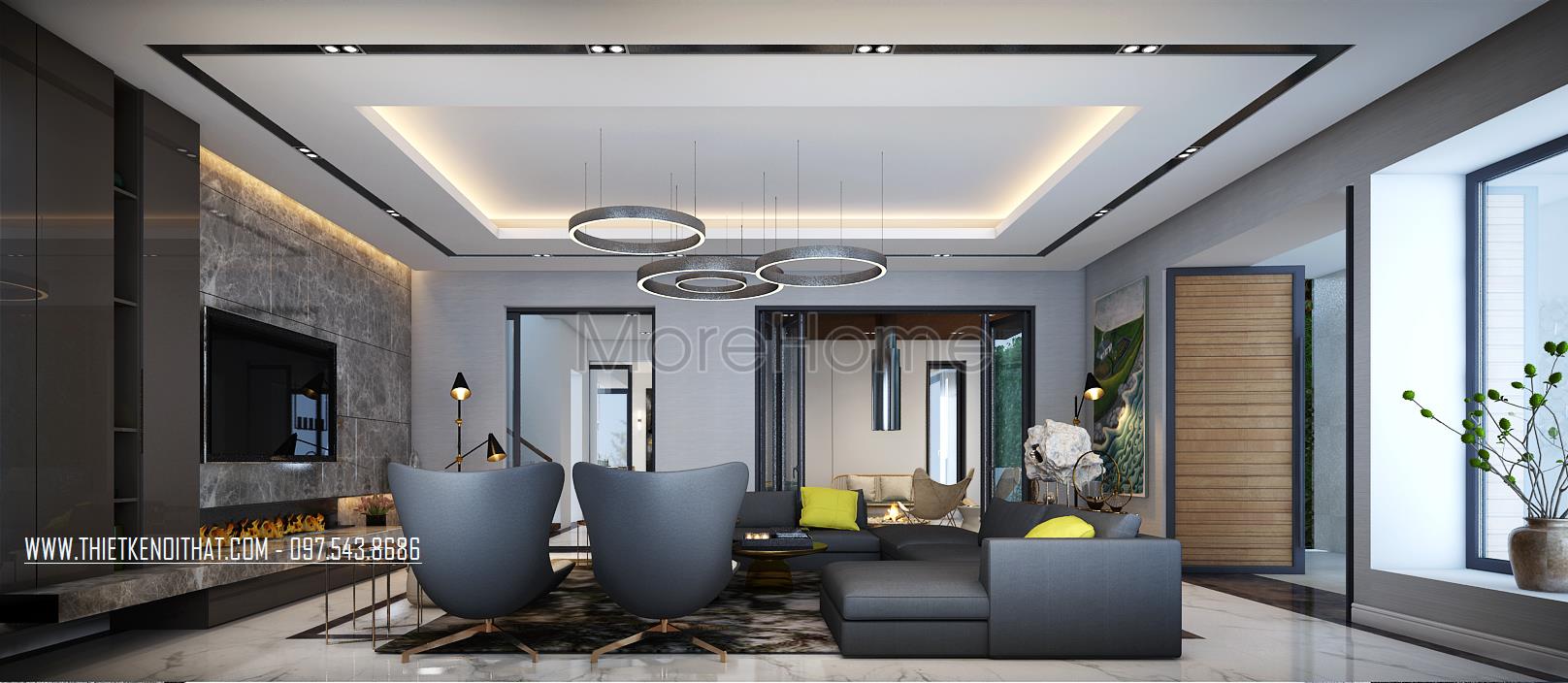 Thiết kế nội thất phòng khách biệt thự hiện đại sử dụng tone màu tối làm chủ đạo. Thiết kế ghế sofa đơn giản, không cầu kỳ về chi tiết, mang đến sự cân bằng và thoải mái về đường nét cho thiết kế. Ghế sofa được lựa chọn khá linh hoạt, có độ mở lớn, dạng to bành vững chãi gợi cảm giác an toàn và vững chãi. Không gian phòng khách bị bao bọc bởi bốn bức tường thô cứng đã được thay đổi hoàn toàn, thay vào đó là thiết kế mở với kính cường lực trong suốt và thiết kế mảng tường vân đá tự nhiên.