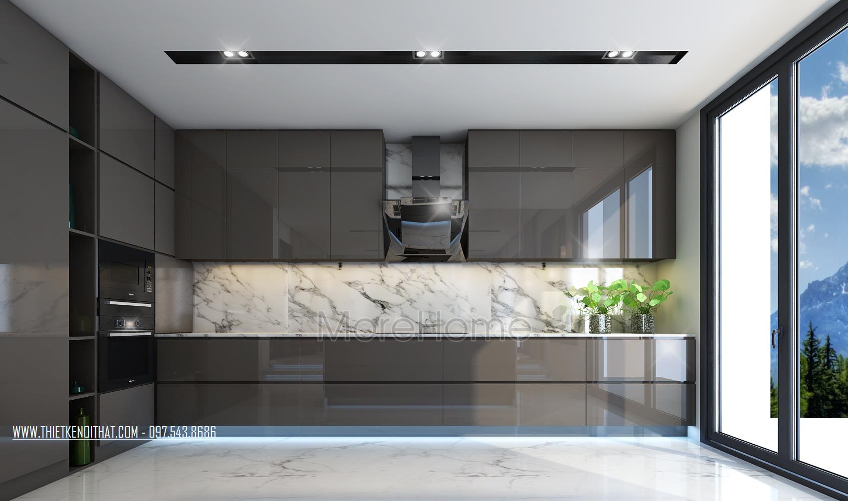 Thiết kế khu bếp hiện đại liền kề không hề tạo vách ngăn giúp gia chủ thuận tiện hơn trong việc di chuyển và tạo độ mở cho không gian. Kệ tủ bếp được thiết kế không quá phức tạp hay cầu kỳ với các chi tiết cầu kỳ, thay vào đó, đây là các chi tiết tối giản, nhấn mạnh vào tính công năng. Các bức tranh lớn hay thiết kế lấy ánh sáng làm tâm điểm chính là sức hút chính của thiết kế này, vừa thể hiện sự hiện đại lại không làm mất đi tính thẩm mỹ và công năng sử dụng.