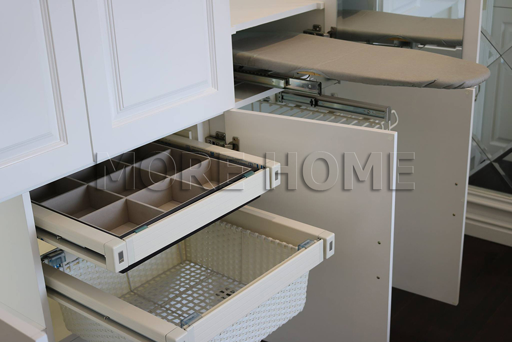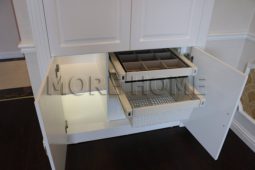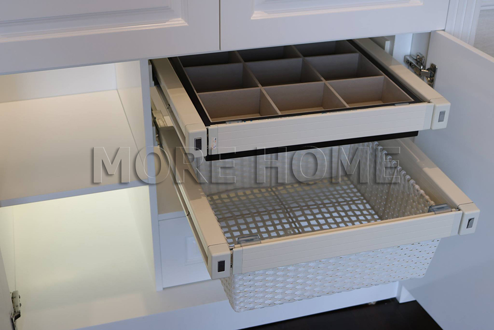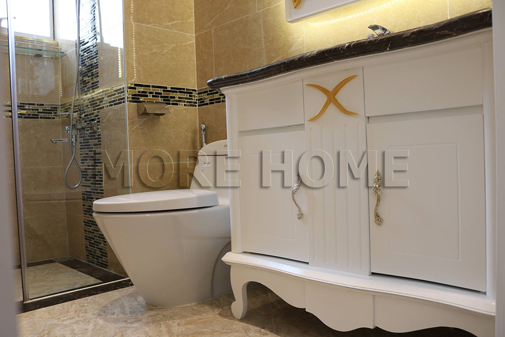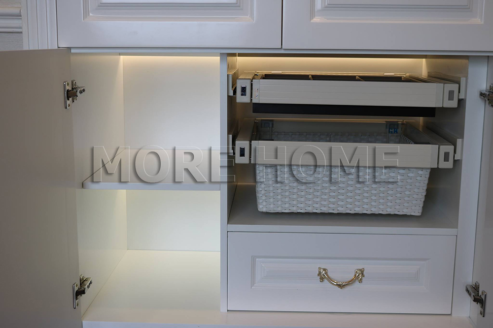 Công trình chủ đạo là tông màu trắng, nhưng Morehome luôn biết cách thi công biệt thự tạo điểm nhấn ấn tượng bởi những chi tiết tạo sự thú vị nổi bật như việc lựa chọn bàn, màu ốp tường và cách trang trí các loại tủ.