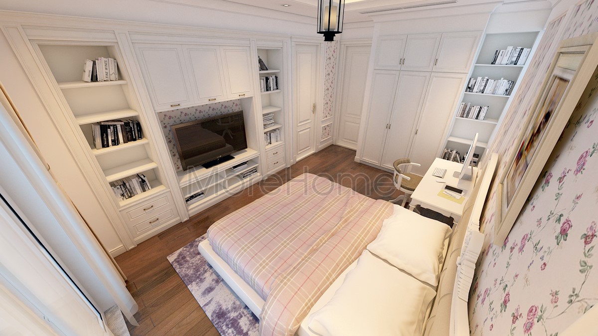 Tiếp đến là không gian phòng ngủ con gái, giấy dán tường hoa với gam hồng nhẹ thể hiện nét nữ tính nhưng không quá sến. Chiếc giường ngủ đơn được thiết kế đơn giản bài trí chính giữa . Trông không gian này có sự xuất hiện của chiếc tủ quần áo cánh trượt cùng nhiều ngăn, với nhiều kệ được phân chia thích hợp bên trong sẽ mang đến sự thoải mái và tiện nghi cho bé khi sắp xếp và bảo quản quần áo cũng như các đồ dùng cá nhân khác.