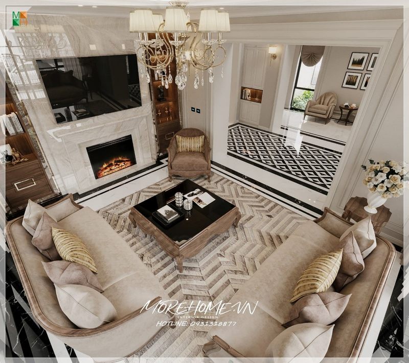 Mẫu thiết kế nhà biệt thự, phòng khách với nội thất gỗ óc chó cao cấp giúp tạo nên không gian rộng lớn, sang trọng và thoáng đãng.