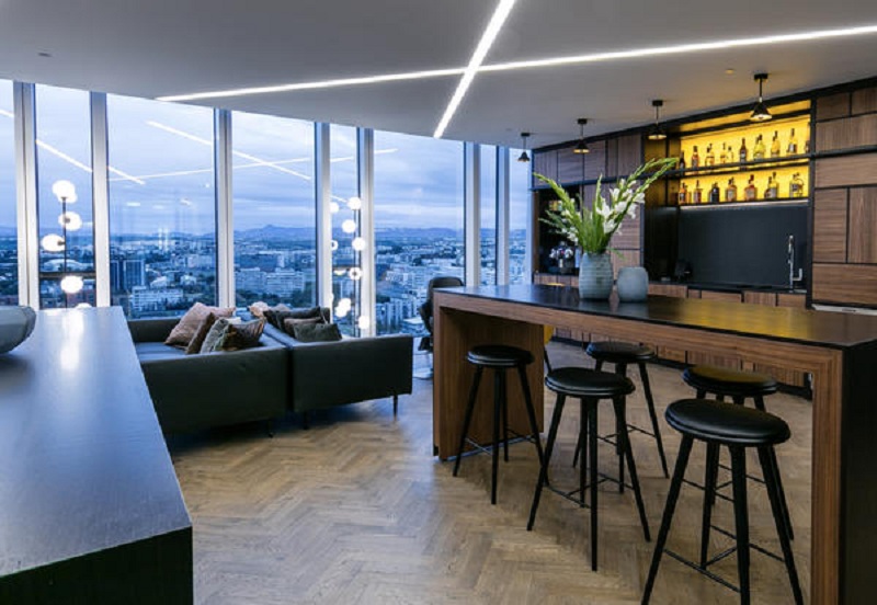 Một không gian khác, nơi có quầy bar, bạn có thể nhâm nhi những ly rượu cùng chuyện trò với bạn bè và thưởng thức khung cảnh tuyệt đẹp của thành phố. Còn điều gì có thể tuyệt vời hơn thế mà thiết kế chung cư này đem lại? Trong Skypelounge, nơi có tác phẩm điêu khắc bằng nhôm lớn, bữa sáng lành mạnh được phục vụ vào buổi sáng, được làm bằng các nguyên liệu tươi và theo mùa.
